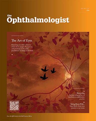 Welcome to The Ophthalmologist July/August 2025! This issue boasts our annual "Art of Eyes" feature, showcasing a fine array of visually arresting and thought-provoking images from practitioners working in and around the field of ophthalmology. We also focus on "The Art of Mentorship," with the University of Limerick's Liam Bourne outlining the "4 A's" of surgical training. In our Practice Fundamentals offerings, Faisal Ahmed describes performing minimally invasive tube surgery (MITS) with the eyePlate-300, and Damien Yeo looks at advances in retinal imaging in babies and young children.