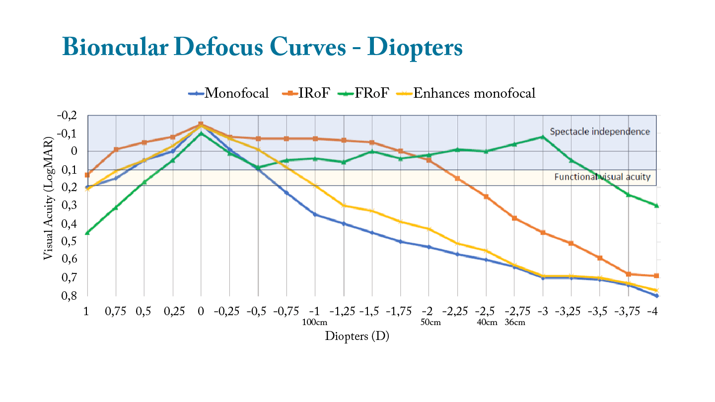 Three months after surgery, we assessed visual acuity without spectacles at three different distances (400 cm, 60 cm, and 45 cm), repeated with various amounts of defocus to create defocus curves, and administered a questionnaire to understand subjective, patient-reported outcomes. This study was conducted in a real-world setting and was retrospective in nature, which does not adhere to the highest standard of a prospective clinical trial. But it does allow me to give patients an idea of the outcomes they can expect, based on other patients implanted with these lenses in our clinic.