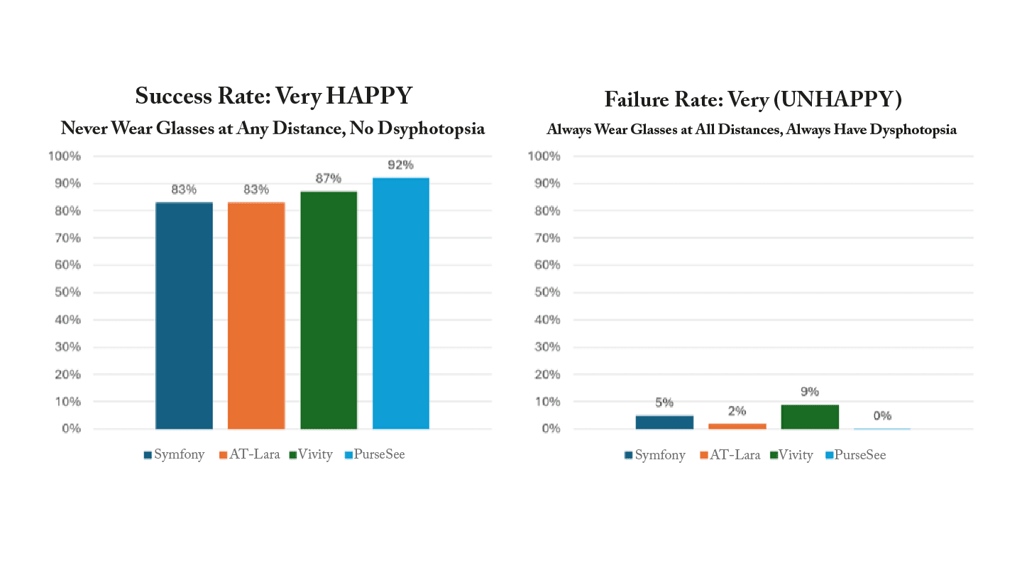 We have excellent options in the extended-depth-of-focus or IRoF category of IOLs. These lenses provide varying levels of performance related to their optical design. Interestingly, however, in this study it was not necessarily those with diffractive optics that provided more nighttime dysphotopsia, as we tend to assume. Although all IOLs tested had satisfactory success rates, the PureSee IOL seems to outperform the other lenses in terms of spectacle independence, range of vision, and reduced night dysphotopsia, making it significantly more likely that patients will be very happy with their results and less likely that they will be very unhappy compared to the other IOLs tested.