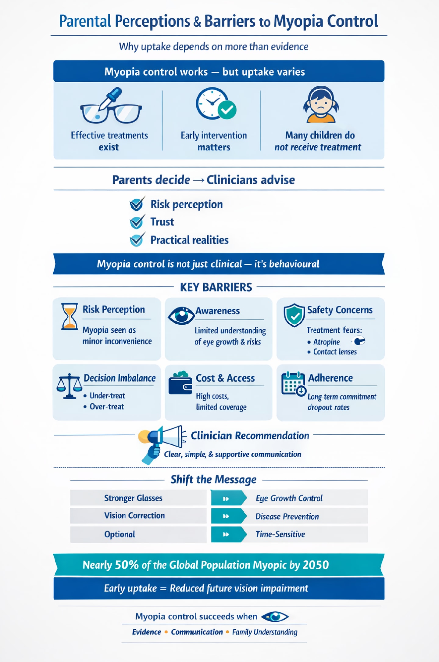 Health literacy further influences engagement (17-19). Concepts central to myopia control, including axial elongation, dose–response risk, and long-term disease prevention, are not inherently intuitive, particularly within the constraints of a time-limited clinical consultation. Where understanding is limited, decision-making may default to the most familiar, least complex option rather than the most effective.