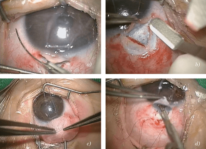 In the West: A population-based study in Olmsted County, Minnesota, USA (4) surveyed childhood glaucoma cases over a 40-year period. Twenty percent of untreated cases eventually resulted in enucleation of a blind painful eye. However, timely management resulted in over 85 percent of children having vision better then 20/200 after five years, with 77 percent retaining this level of acuity after 10 years. In the East: A study in Saudi Arabia supports the view that glaucoma presentations are more severe in Eastern communities. Timely management combined with surgery resulted in complete success in close to 75 percent of cases; less aggressive interventions had lower success rates (5). In my series, successful surgery has managed to cure 95.5 percent of children with PCG and 83 percent with glaucoma after congenital cataract surgery. Of these, corneal edema and scarring with subsequent partial morbidity accounted for 15 percent of PCG cases and seven percent of glaucoma after congenital cataract surgery cases. Permanent morbidity was present in the failed cases (4.5 percent and 17 percent respectively).Surgical choices in juvenile glaucoma are limited, with filtering surgery, also known as trabeculectomy (see Figure 2b, 2d), along with antimetabolites (see Figure 2c) being the clear procedure of choice. Choices for congenital and infantile glaucoma are more diverse. In cases with clear corneas and relatively mild IOP elevation (that is, a typical Western presentation), angle surgery – whether ab interno goniotomy or ab externo trabeculotomy (Fig. 2a) – is an effective and valid choice, and normally highly successful. For cases with hazy cornea and an accompanying severe elevation of IOP (that is, case presentations typical of Egypt and other Eastern locations), the only possible angle surgery is ab externo trabeculotomy. Other options include trabeculectomy with special emphasis on the use of antimetabolites, and primary glaucoma drainage devices, such as the Bærveldt implant or the Ahmed valve. In severe cases, a combination of procedures is especially useful, such as combined trabeculotomy-trabeculectomy and topical application of cytodestructive mitomycin C, for which reported success rates are in the range of 75 to 94 percent (4, 5).