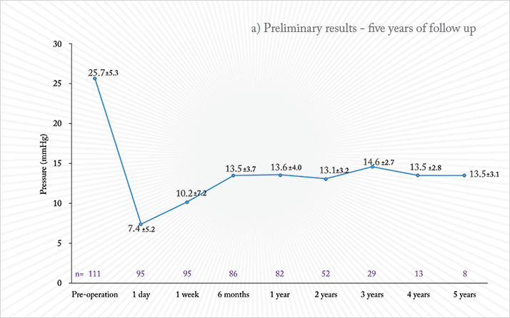 In initial clinical studies performed in 2003–2004 with the CLASS procedure immediate success was seen in all cases; however, about one-half of the cases failed during follow-up, because of tissue scarring. The initial laser parameters had been set at low energy and long exposure time, essentially performing less tissue ablation and more photocoagulation. Appropriate adjustments were made to the laser parameters. We now have data for up to five years on human eyes using the third generation of the IOPtimate system. In a prospective, multi-center study of 111 patients, the procedure was performed on 85 eyes with POAG and 26 eyes with PEXG and an average IOP of 25.7 +/- 5.3 mmHg. Mean IOP (see Figure 2a) dropped to 13.5 +/- 3.7 mmHg at six months post-operative (N=86) and remained stable through three years (N=29) and five years post-operative (N=8). The average number of hypotensive medications (Figure 2b) dropped from a mean of 2.3 +/- 1.2 at baseline to 0.3 +/- 0.7 at six months post-operative, 0.6 +/- 0.8 after three year and 0.8 + 1.0 after five years. At three years post-operative, 87.5 percent of patients achieved a reduction in IOP of 20 percent or greater, maintaining an IOP less than or equal to 18 mmHg; 59.4 percent of patients were able to maintain the IOP goals without use of any medication. Mitomycin C was used in 93 percent of procedures.