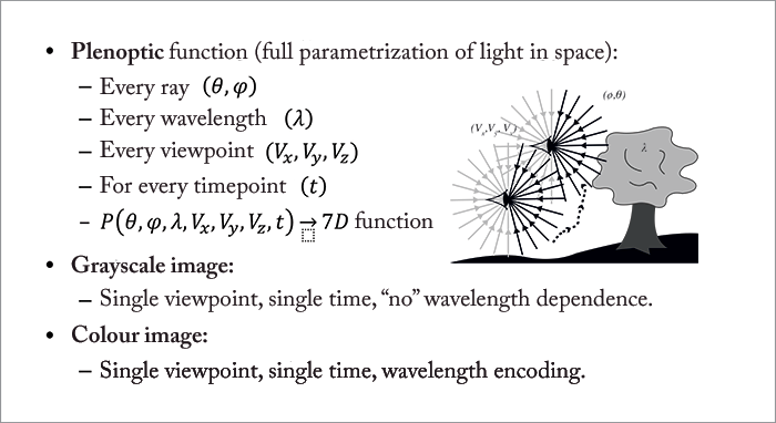 You might refer to a photograph as a “snapshot.” That’s a great term – it evokes what a photograph is in terms of light: the total sum of light rays striking each point at an image in a single point of time. What a photograph doesn’t do is record the amount of light travelling along the individual rays that make up the image, which as we’ll see soon, can be very useful. An apt analogy is that of an audio recording studio (1): a photograph is a recording of all instruments being played together on a single track; but what works better is the recording of each individual instrument on a separate audio track – it means producers can improve and fix things in the mix.In terms of digital photography, there is a way of achieving “multitrack” imaging: digital light field photography (DLFP). It works by exploiting the fact that you can produce digital camera photosensors with hundreds of megapixels – yet you don’t really need more than two megapixels for a standard 4" × 6" photograph. You use that spare capacity to sample each individual ray of light that contributes to the final image – the full parametrization of light in space, or the plenoptic function (Figure 1). What’s sampled, therefore, is termed the “light field” – a term borrowed from computer graphics, and just like in a virtual model, you can start to process that information, and generate different outputs – like points of focus.