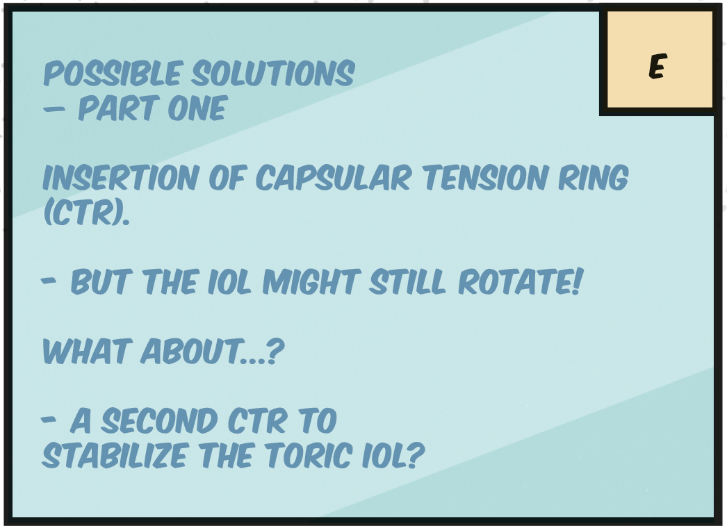 E. How about placing a CTR? Lots of authors have published on this, but the problem is that even after the insertion, the IOL can still rotate. How about inserting two CTRs? Sagiv and Sachs reported that implanting two can stabilize the toric IOL.