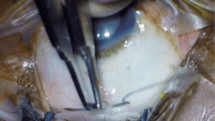 Surgeon position, bridle suture, conjunctival cutdown The patient is typically given a peribulbar block, prepped with an iodine-based antiseptic, and a lid speculum placed as with typical phacoemulsification. The characteristics of an “ideal first patient” are given in "Characteristics of an ideal first SICS patient" below. Most beginning surgeons sit superiorly. The advantages to this are the potential placement of a bridle suture under the superior rectus for better exposure, and coverage of the wound by the lid (Figure 2). Another option is a temporal approach that allows easier exposure and leads to less astigmatism, but less coverage of the wound. A compromise is sitting superior-temporally, which gives good coverage of the wound, but potentially less surgeon-induced astigmatism (4). The next step is the conjunctival cutdown made for approximately 6–8 clock hours down to bare sclera. Scleral bleeding can be controlled by cautery; many prefer wet field cautery, if available.