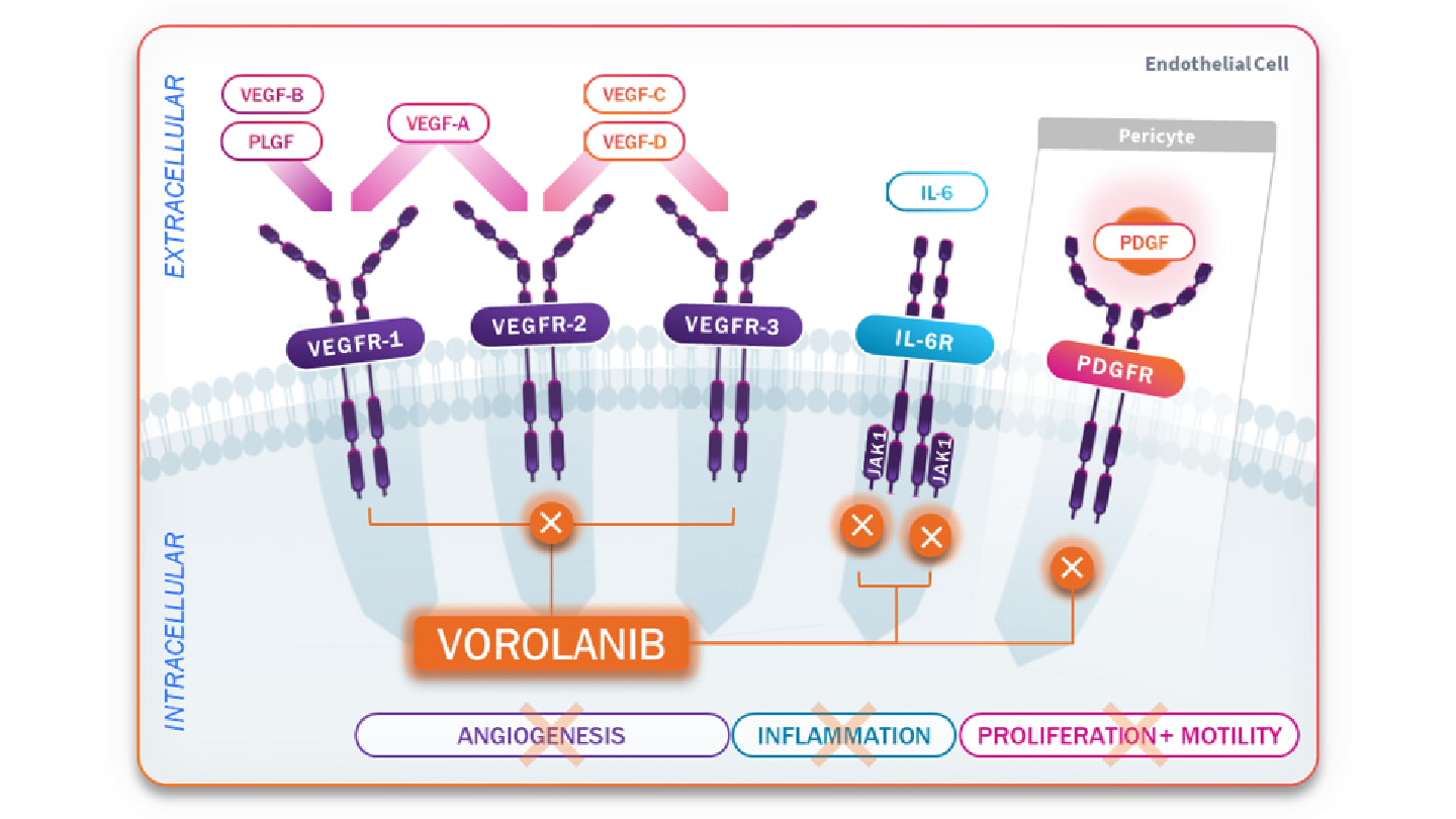 EYP-1901 (vorolanib intravitreal insert; DURAVYU™)* utilizes next-generation bioerodible Durasert E™ technology to provide sustained release of the tyrosine kinase inhibitor (TKI) vorolanib at therapeutic levels for at least six months after a single injection. Vorolanib offers a novel multi-mechanism of action, working intracellularly to suppress angiogenesis through the inhibition of all vascular endothelial growth factor receptors (VEGFRs) and platelet-derived growth factor receptor (PDGFR), along with suppression of inflammation via inhibition of interleukin-6 (IL-6) signaling (Figure 1) (17). EYP-1901 has been evaluated in a robust clinical trial program, including the proof-of-concept phase 1 DAVIO (NCT04747197) trial in wet AMD, phase 2 DAVIO 2 (NCT05381948) trial in wet AMD, and phase 2 VERONA (NCT06099184) trial in DME (18-20). Key findings from the DAVIO 2 and VERONA studies were featured in three presentations at the 49th Macula Society Annual Meeting.