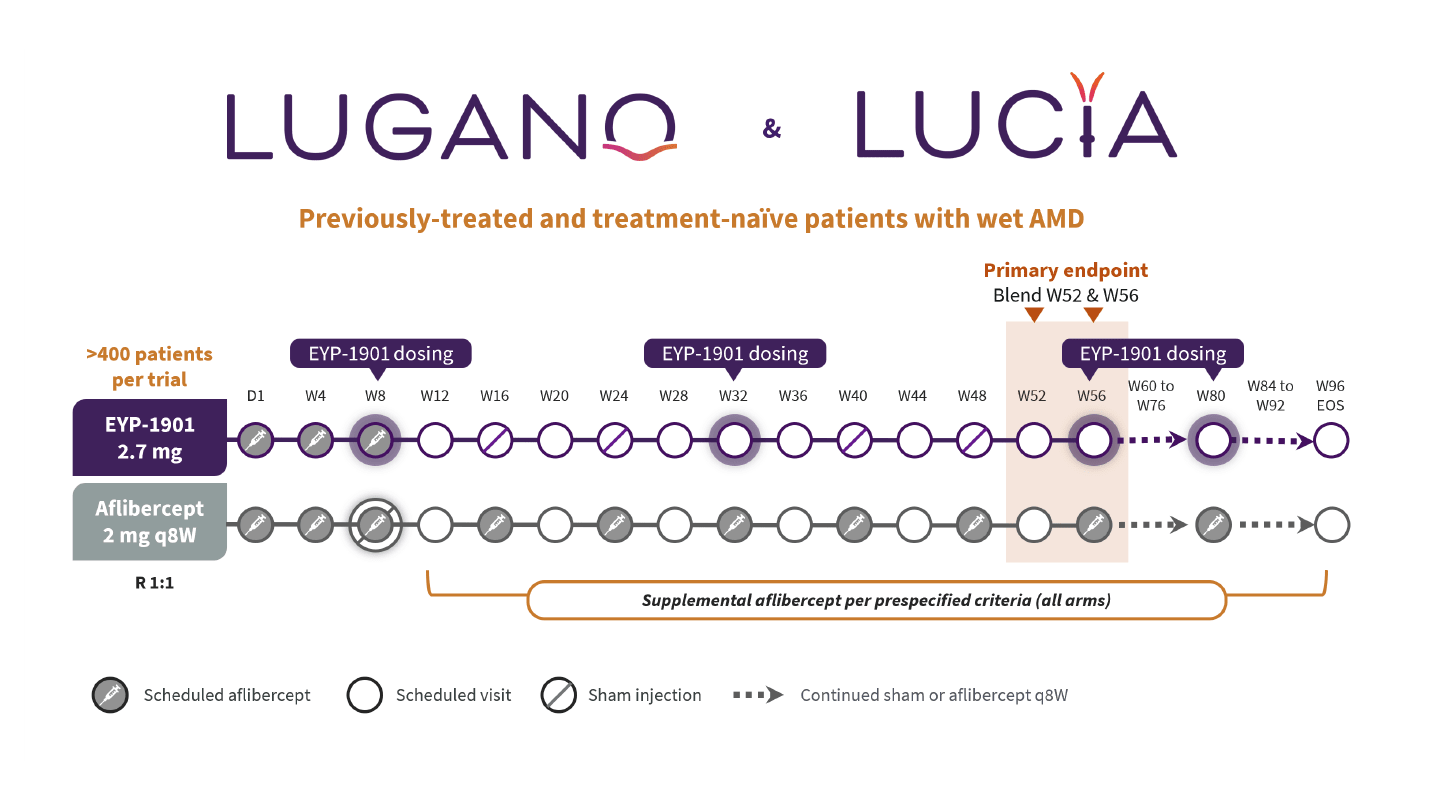 Across four completed clinical trials to date, EYP-1901 has demonstrated a favorable tolerability profile with no EYP-1901-related safety signals observed (17). Informed by the positive phase 2 trials, pivotal phase 3 trials evaluating EYP-1901 with six-month redosing versus on-label aflibercept 2 mg q8W are underway in both wet AMD and DME. The ongoing LUGANO (NCT06668064) and LUCIA (NCT06683742) trials enrolled 432 and 475 treatment-naïve and previously-treated patients with wet AMD, respectively (Figure 2). Topline data for LUGANO are anticipated mid-2026, with LUCIA to shortly follow (24, 25). Preparations for the pivotal COMO and CAPRI trials in DME are ongoing (ClinicalTrials.gov registration pending). Each trial will enroll approximately 240 treatment-naïve and previously-treated patients with DME (Figure 3), with first patient dosing anticipated first quarter of 2026 (26). A comprehensive, robust clinical trial program supports EYP-1901’s potential to improve long-term visual outcomes and reduce treatment burden in wet AMD and DME.